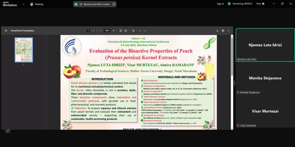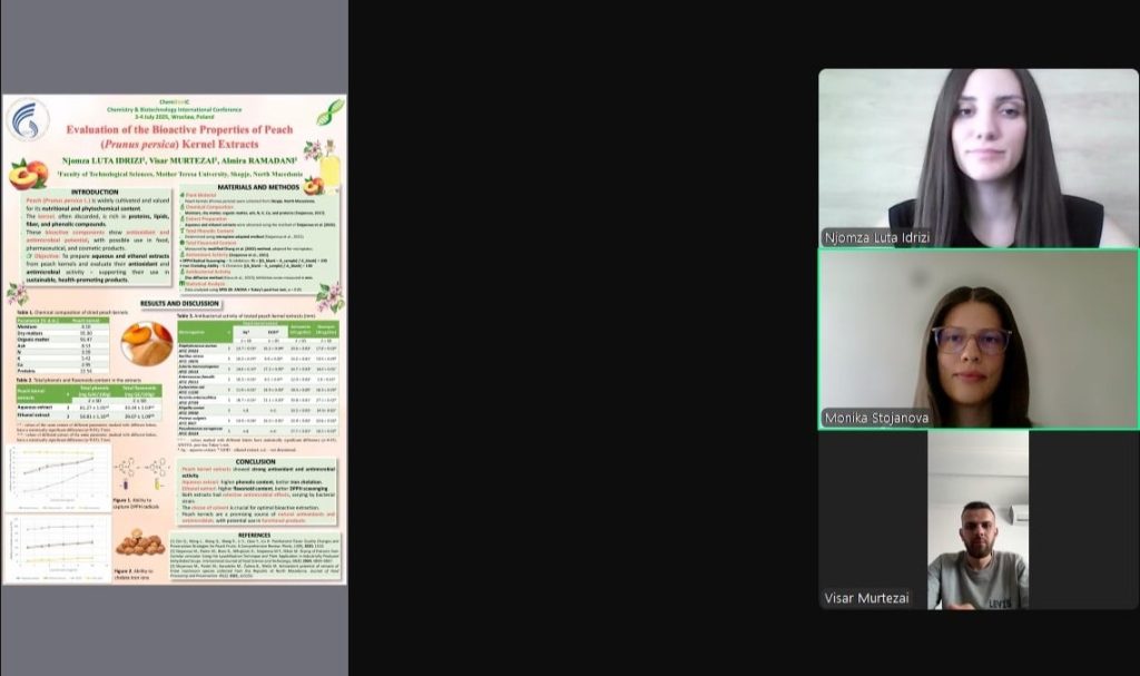 Студентите Њомза Лута, Висар Муртезаи и Алмира Рамадани со гордост го претставија Универзитетот „Маjка Тереза“ на меѓународната конференција ChemBiotIC 2025 во Полска, со научен постер за биолошките својства на екстрактите од праска.