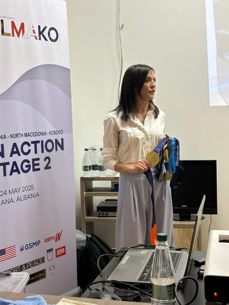 Tiranë, Maj 2025 – Studentët e programit Sport dhe Shkenca Sportive pranë Fakultetit të Shkencave Sociale të Universitetit “Nënë Tereza” në Shkup morën pjesë në seminarin ndërkombëtar “Leadership Through Sport – Sports Diplomacy Program”, të zhvilluar më 23–24 maj 2025 në Tiranë, në kuadër të iniciativës TALMAKO – Albania–North Macedonia in Action, me mbështetje nga Departamenti i Shtetit të SHBA-së, GSMP, ESPNW dhe Ambasada e SHBA-së në Tiranë.
