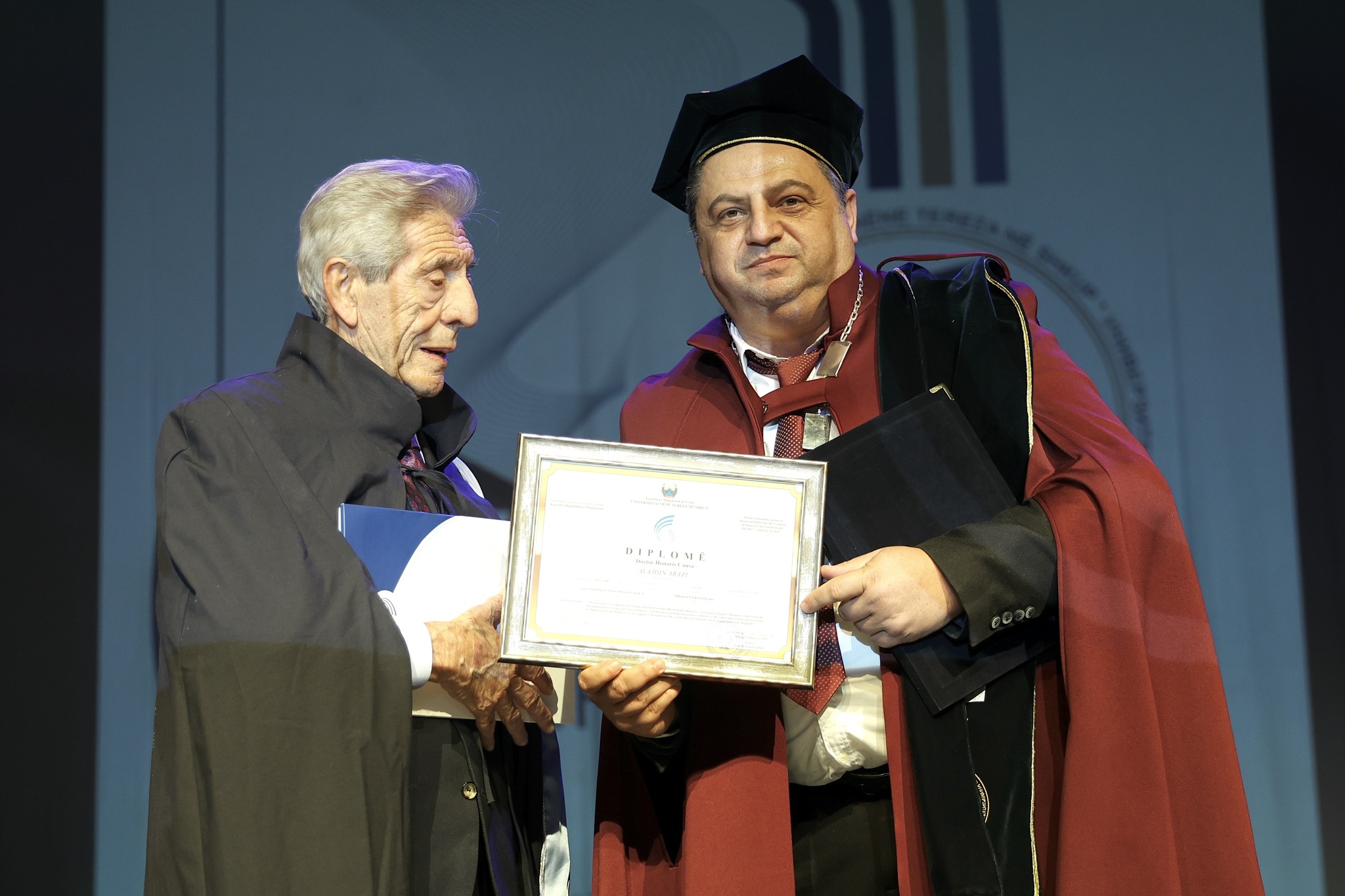 The highlight of the ceremony was when the Rector of Mother Teresa University, Full Prof. Bekim Fetaji, Ph.D., awarded the title Doctor Honoris Causa to academician Lecturer Alajdin Abazi, Ph.D. On this occasion, MTU Rector, Full Prof. Bekim Fetaji, Ph.D., highly praised academician Abazi as an architect of higher education in the Albanian language in North Macedonia.