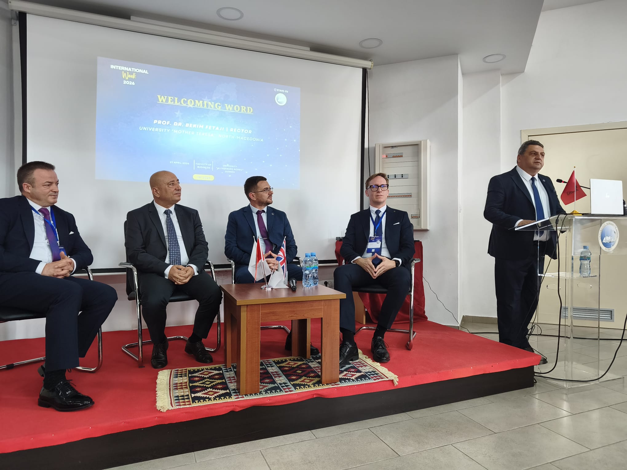 Durrës, 27.04.2026 – Në kuadër të bashkëpunimit rajonal dhe ndërkombëtar, rektori i Universitetit “Nënë Tereza” në Shkup, Prof. Dr. Bekim Fetaji, ishte pjesë e panelit të akademikëve të ftuar në “Javën Ndërkombëtare” (International Week), organizuar nga Fakulteti i Biznesit i Universitetit “Aleksandër Moisiu” në Durrës.